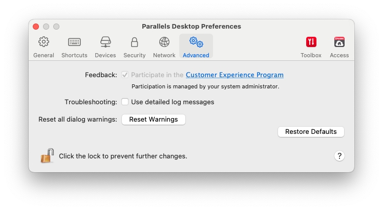 要防止 Parallels Desktop“偏好设置”发生未经授权的更改,请单击窗口底部的锁图标。下次如果要在 Parallels Desktop“偏好设置”的任何窗格中更改设置,必须提供管理员密码。
