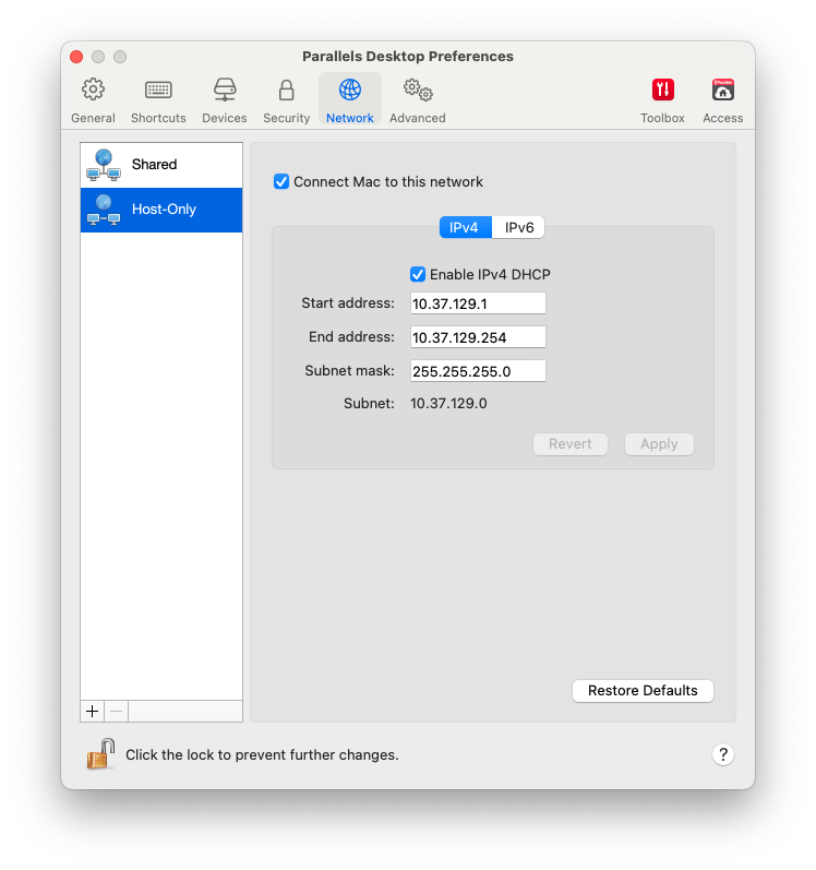 **注意：**&#x48;ost-Only 网络设置仅在 Parallels Desktop for Mac Pro Edition 中提供。