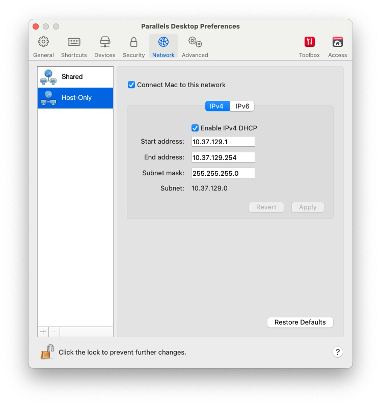 若要更改 Host-only 网络设置,请选择 Parallels Desktop 偏好设置的网络选项卡并单击 Host-Only。您会看到以下窗口: