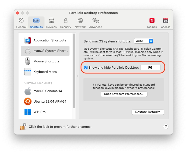 如果 Parallels Desktop 目前可见但在后台运行,按下 Fn-F6 会调出 Parallels Desktop 及其所有窗口。显示和隐藏 Parallels Desktop 的键可以在 Parallels Desktop 首选项的快捷方式选项卡中配置: