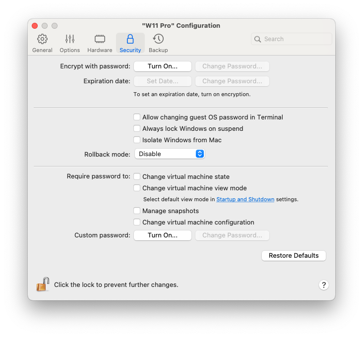 在虚拟机配置的安全选项卡上,您可以将虚拟机与 Mac 隔离,选择是保存还是放弃使用虚拟机时所做的更改,为某些任务设定密码要求,以及执行更多操作。