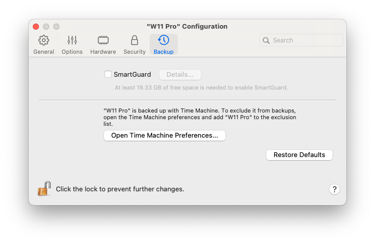 在虚拟机配置的备份选项卡中,您可以自动保存虚拟机快照,并选择是否使用 Time Machine 备份虚拟机。