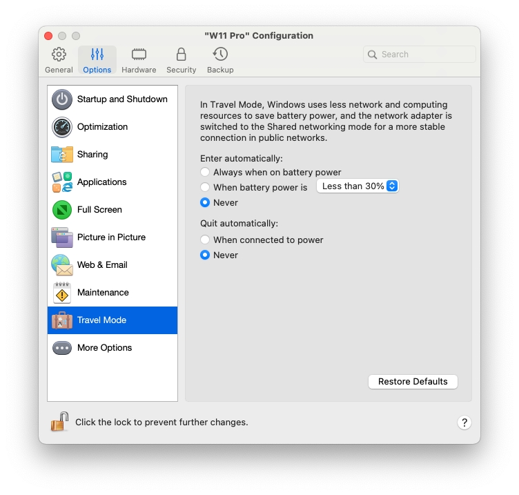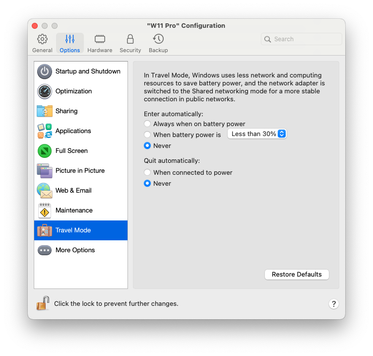 在旅行模式下使用虚拟机来延长 Mac 电池的使用时间。该模式在您旅行时使用电池给 Mac 供电时很有用。