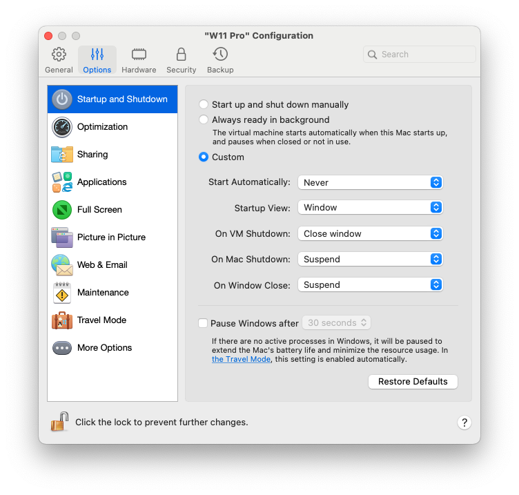 如果 Windows 中没有活动进程,它仍将消耗您 Mac 的 CPU 资源。选择此选项并指定一段无操作时间,达到该时间段后将自动暂停 Windows。这样,Windows 服务就会使用更少的 CPU 资源,可让您节省电池电量并为环境提供帮助。