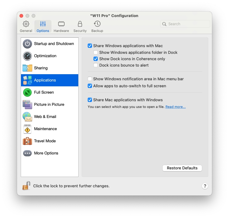 可以选择是否在窗口模式或全屏模式下在 macOS Dock 中显示 Windows 应用程序图标。如果您希望在 Windows 桌面上使用这些应用程序,则不想让这些程序的图标与 macOS 应用程序图标一起显示在 Dock 中,因为这样会分散您的注意力。