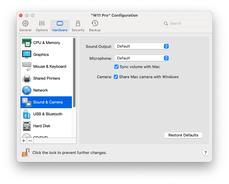 在音频和摄像头窗格中,可以查看和配置音频设备参数,并将 Mac 摄像头与虚拟机共享。