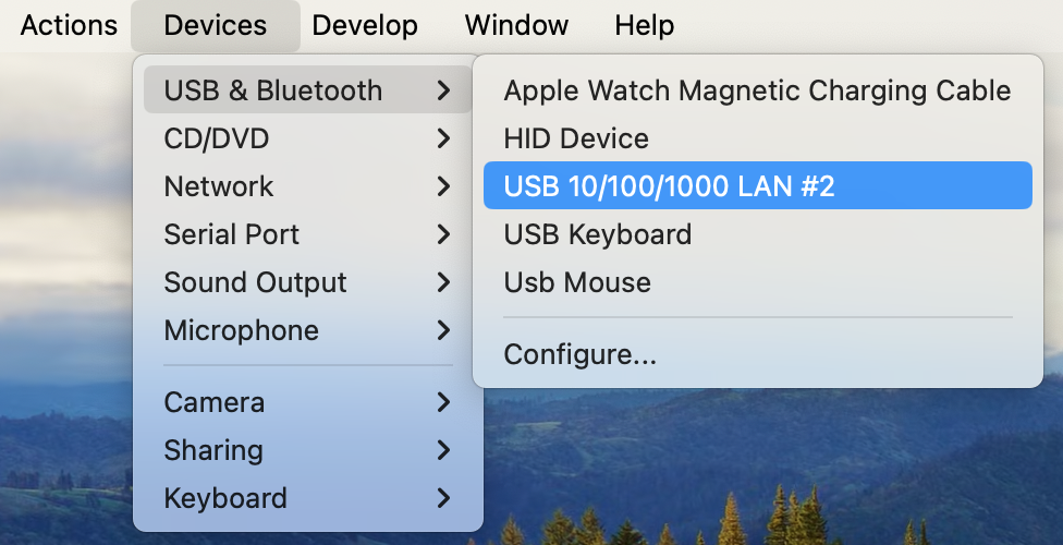* 如果 Windows 是在全屏模式或窗口模式下运行，请将鼠标指针移至屏幕顶部，依次单击**设备** > **USB 和蓝牙**，然后选择要连接的设备。<br>