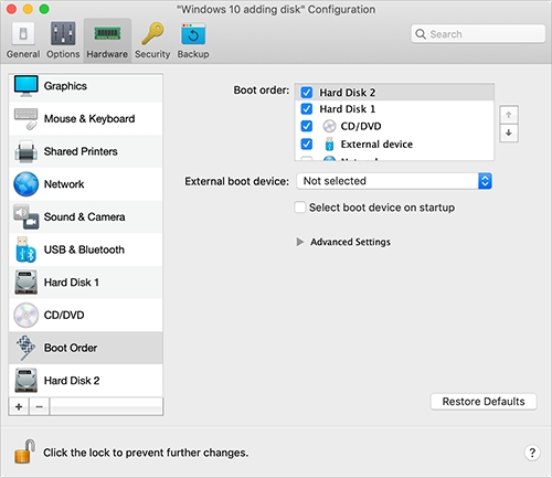 点击 macOS 菜单栏中的 Parallels 图标,然后选择配置以打开虚拟机配置。然后选择硬件,点击添加按钮 (+) 并选择硬盘。