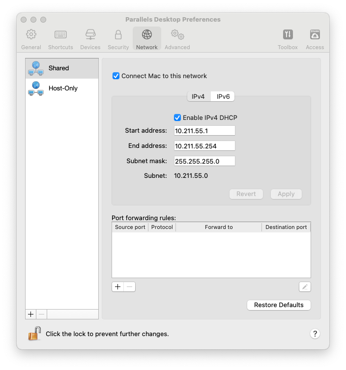 若要更改共享的 Host-only 网络设置,请选择 Parallels Desktop 偏好设置的网络选项卡并单击共享。您会看到以下窗口: