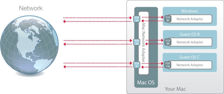 通常情况下,设置为在共享网络模式下运行的虚拟机无法从外部电脑进行访问。端口转发功能允许本地网络和互联网上的电脑将数据传输到使用共享网络模式的任何虚拟机。发送到 Mac 指定端口的数据会根据端口转发规则重定向到虚拟机的指定端口。