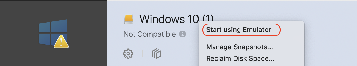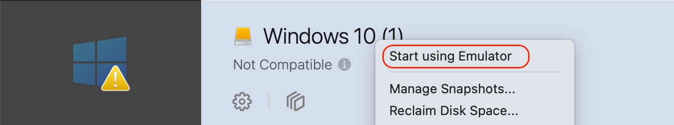 .pvm文件复制到您的Apple Silicon Mac的Parallels Desktop虚拟机文件夹,右键单击该文件,然后选择打开方式 > Parallels Desktop。导入的虚拟机在控制中心中最初会被标记为不兼容。右键单击它并选择开始使用模拟器选项。