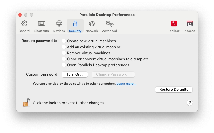 要启用这些偏好设置,请依次选择**“Parallels Desktop”和“偏好设置”,然后单击“安全”**。