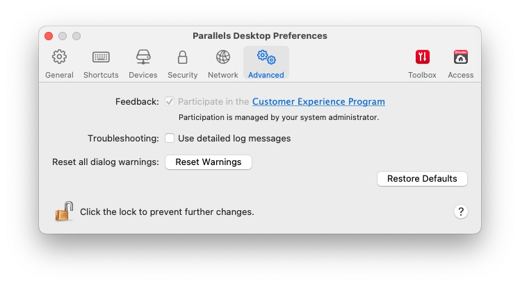 使用高级偏好设置可以参与客户体验计划、重置隐藏消息,并让 Parallels Desktop 创建更详细的日志文件。