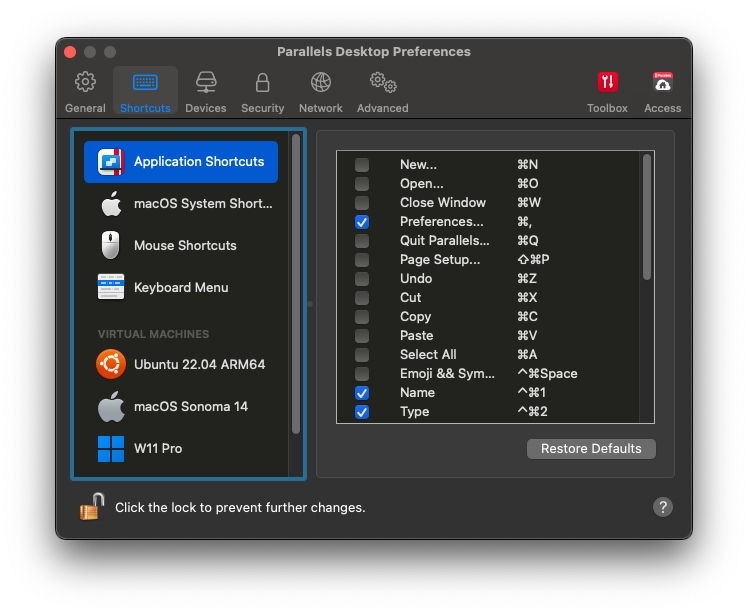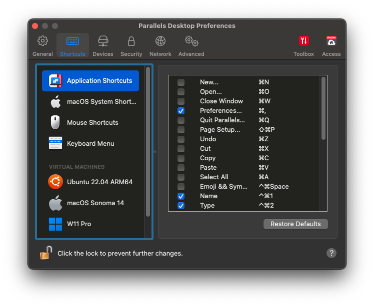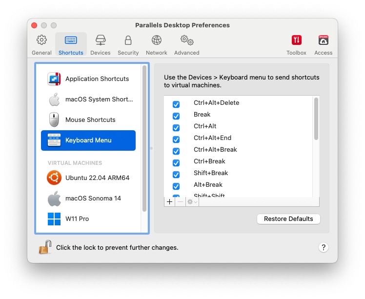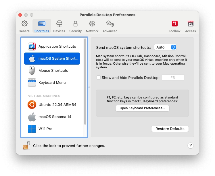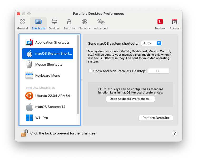 要启用这些偏好设置,请依次选择**“Parallels Desktop”和“偏好设置”,然后单击“快捷键”**。