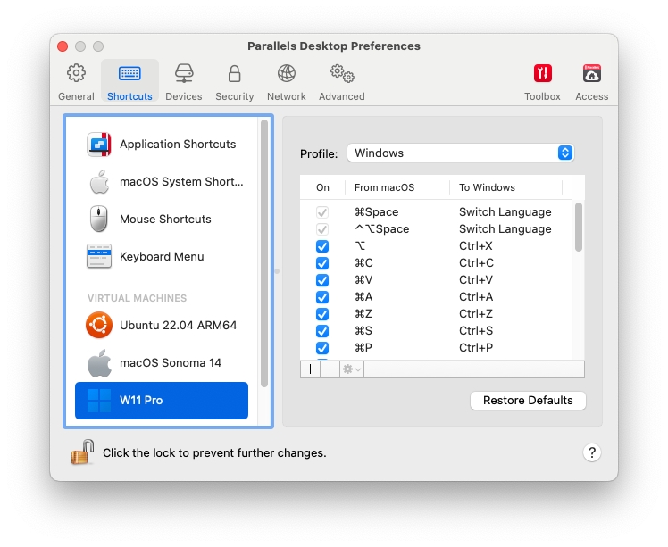 默认情况下,Parallels Desktop 将常用的 macOS 键盘快捷键组合映射到对等的 Windows 组合键。这样可方便您进行操作。例如,如果您习惯了在 macOS 中通过按下 Command-C 来复制文本,则不必切换到 Windows 中对等的 Control-C。