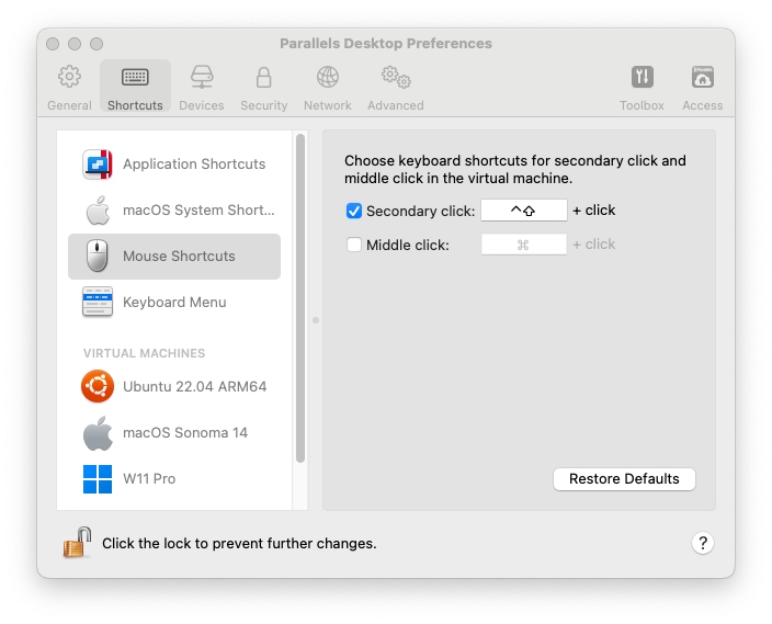Windows 中的许多任务(如调出快捷菜单)均通过右击完成。默认情况下,Parallels Desktop 设置为当您按下 Shift+Control 并单击鼠标时模拟右击。您可以更改触发右击的组合键。请执行以下操作: