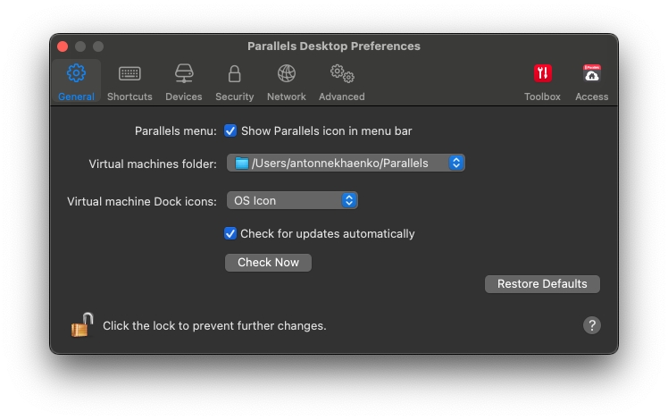 使用通用偏好设置来指定是否可在 macOS 菜单栏中使用 Parallels 菜单,更改存储虚拟机的文件夹等。