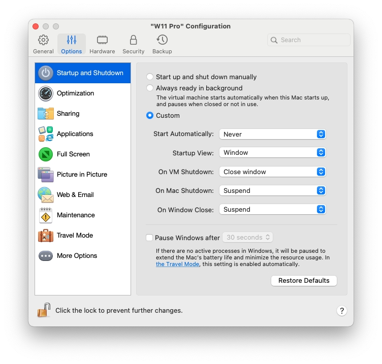 如果 Windows 中没有活动进程,它仍将消耗您 Mac 的 CPU 资源。选择此选项并指定一段无操作时间,达到该时间段后将自动暂停 Windows。这样,Windows 服务就会使用更少的 CPU 资源,可让您节省电池电量并为环境提供帮助。