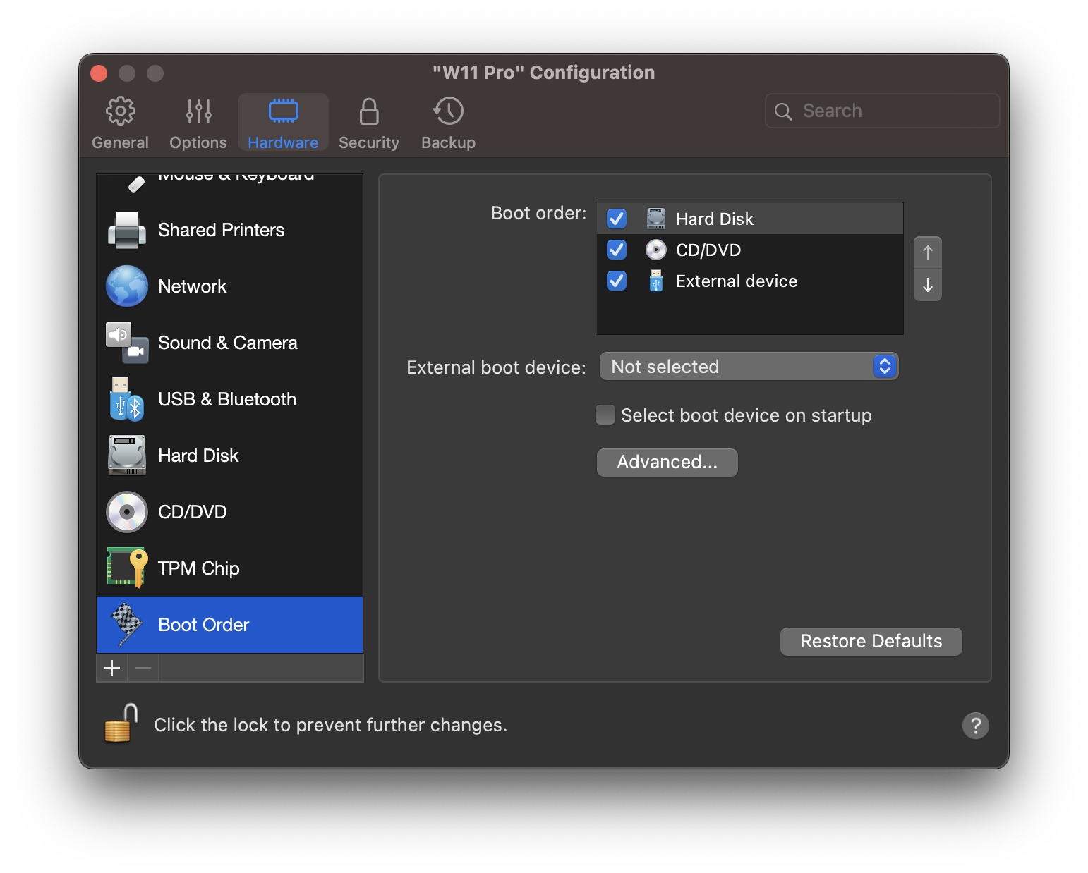 在启动顺序窗格,您可以查看和配置虚拟机的启动顺序列,即虚拟机尝试从不同的启动设备加载操作系统的顺序。