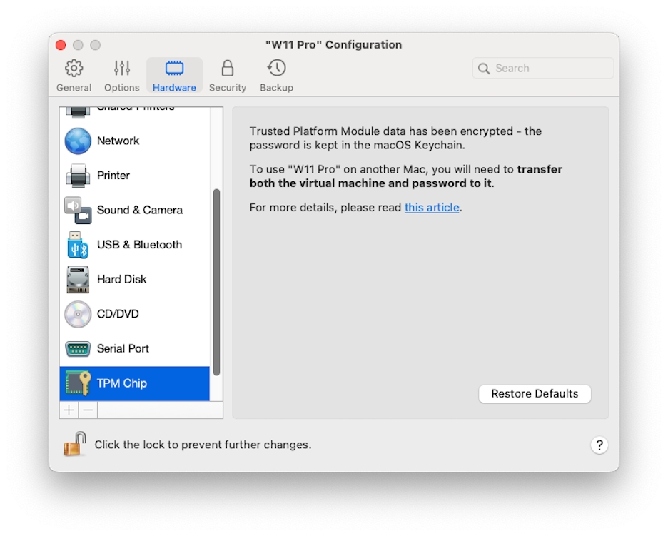 注意:与 TPM 相关的信息存储在 Mac 钥匙串中。如果没有此信息,您将无法在另一台 Mac 上启动虚拟机,除非另一台 Mac 登录到了相同的 Apple 帐户且启用了钥匙串同步选项。要手动传输与 TPM 相关的信息,请参阅上文提到的知识库文章。