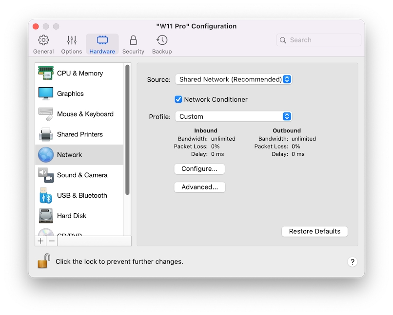 在此菜单中,您可以使用它来更改网络接口卡的类型。我们不建议您更改默认设置,除非 Parallels 支持团队告诉您这样做。此选项仅高级用户可用。