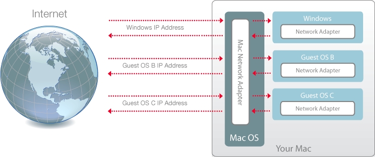 当以桥接以太网模式运行时,Windows 在网络中显示为拥有其自身 IP 地址和网络名称的单独电脑。