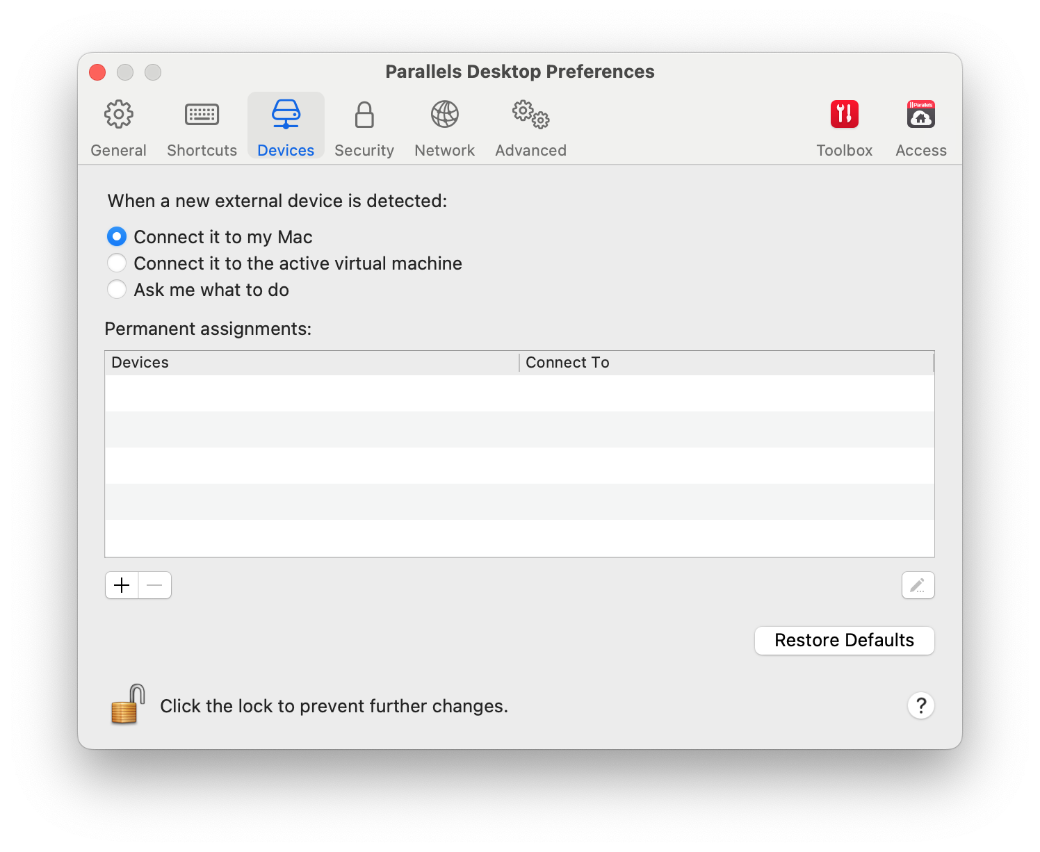 在 Parallels Desktop 偏好设置中的“设备”窗格,您可以: