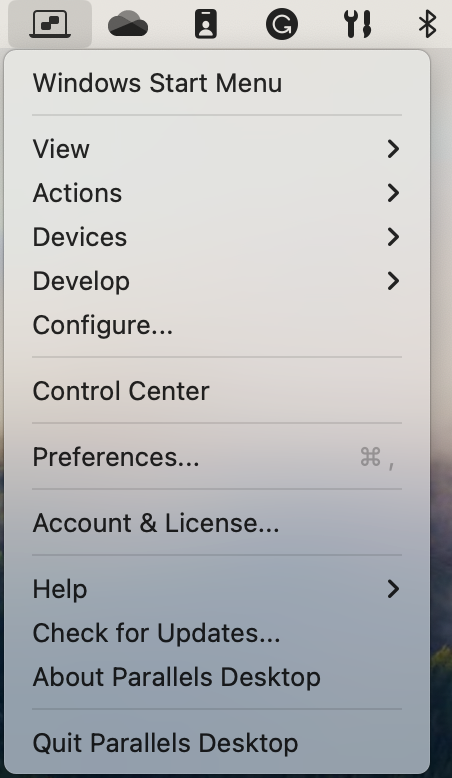 单击 Parallels Desktop 图标可以打开包含以下项的基本菜单: