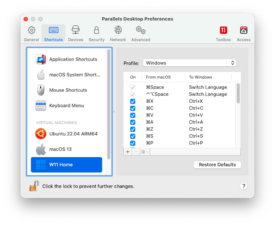 默认情况下,Parallels Desktop 将常用的 macOS 键盘快捷键组合映射到对等的 Windows 组合键。这样可方便您进行操作。例如,如果您习惯了在 macOS 中通过按下 Command-C 来复制文本,则不必切换到 Windows 中对等的 Control-C。