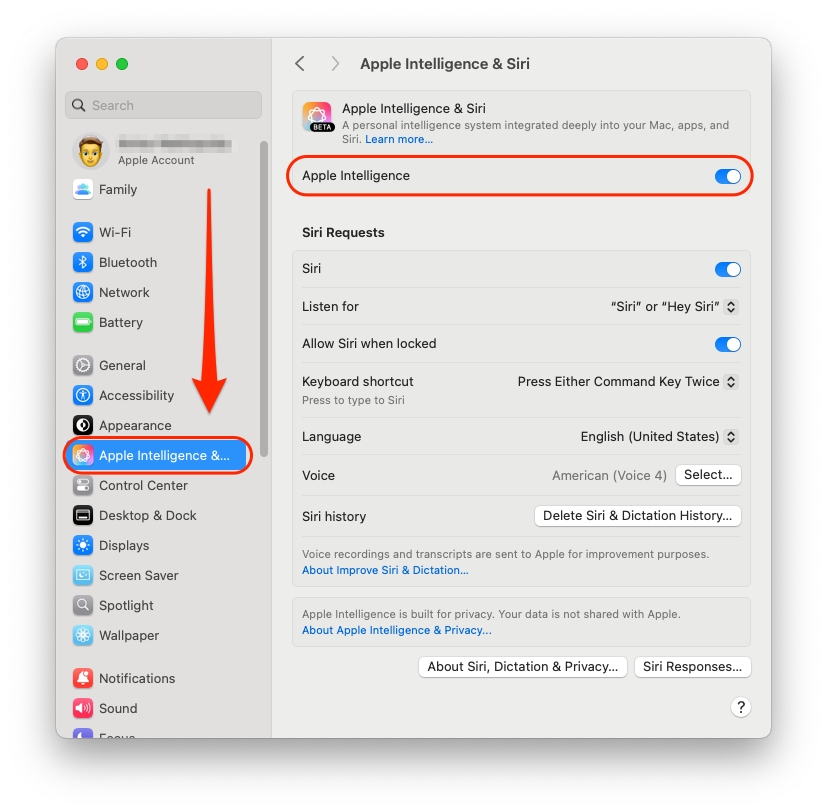 更新之后,在系统设置菜单中,滚动到 Apple Intelligence 与 Siri 部分,确保 Apple Intelligence 切换开关处于开启状态;
