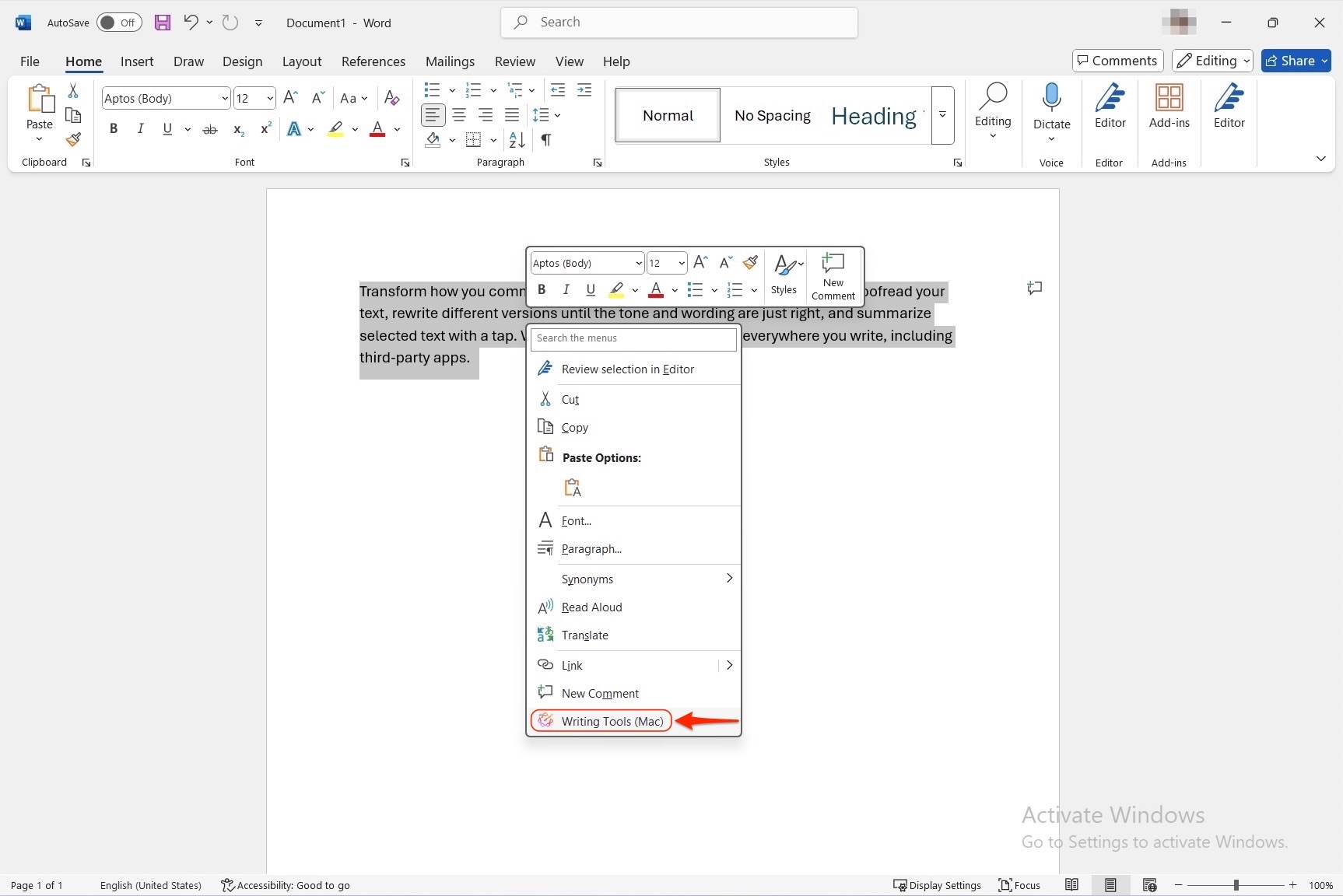 有了 Parallels Tools,您现在可以使用 Apple 写作工具在 Microsoft Word 等 Windows 应用中改进文本。