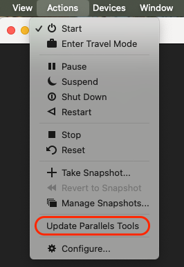 在 macOS 菜单栏中,选择操作菜单,查看是否存在 Parallels Tools 更新选项。如果存在,选择该选项,然后按照步骤操作。