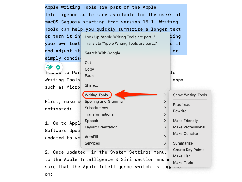 要使用它们,请选择一个文本块,右键单击该文本块,然后选择 写作工具(Mac)菜单项。