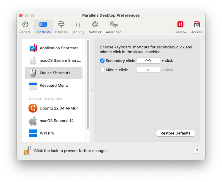 Windows 中的许多任务(如调出快捷菜单)均通过右击完成。默认情况下,Parallels Desktop 设置为当您按下 Shift+Control 并单击鼠标时模拟右击。您可以更改触发右击的组合键。请执行以下操作: