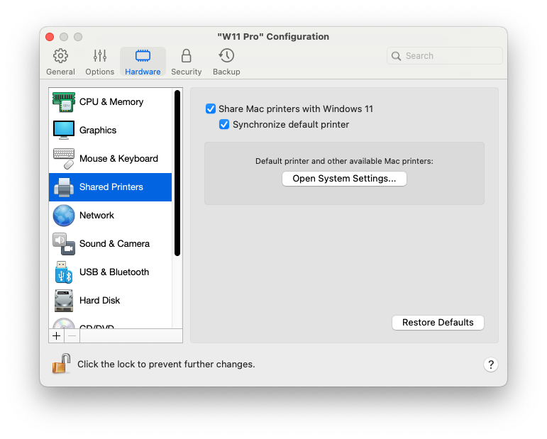 打印机。您可使用虚拟机中任何连接到 Mac 的打印机。从列表中选择相应的打印机。