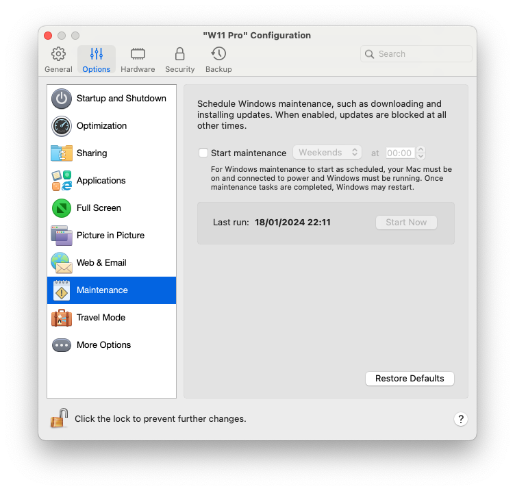 在虚拟机配置的备份选项卡中,您可以自动保存虚拟机快照,并选择是否使用 Time Machine 备份虚拟机。